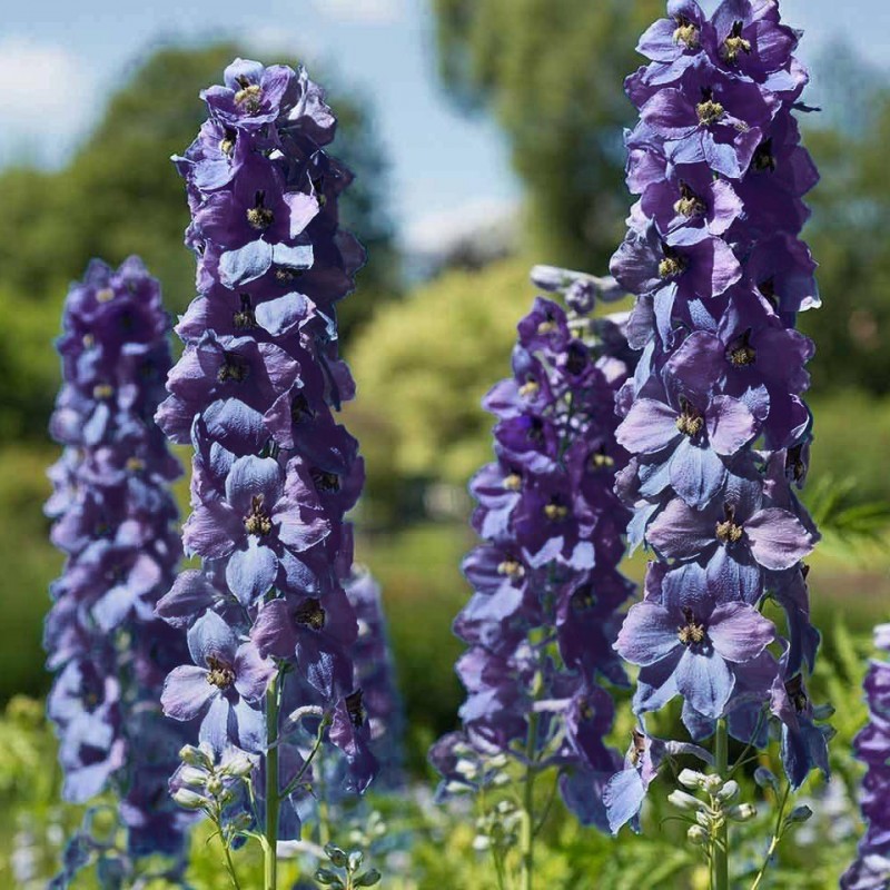 Spektakularna wysokość: Ostróżka ta osiąga nawet 150 cm, tworząc pionowe ściany koloru, które idealnie maskują mniej atrakcyjne części ogrodu lub tworzą tło dla niższych roślin.