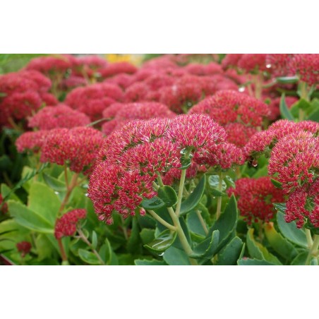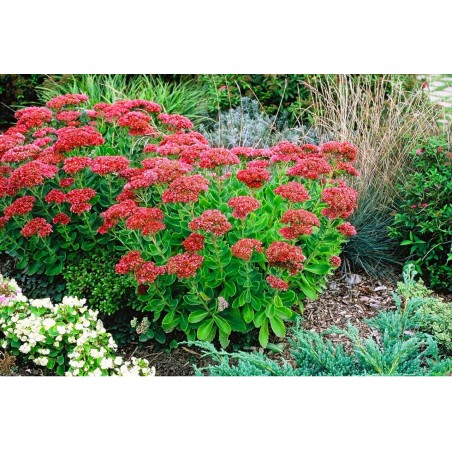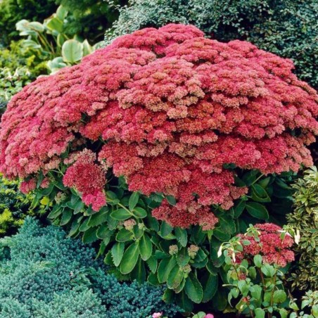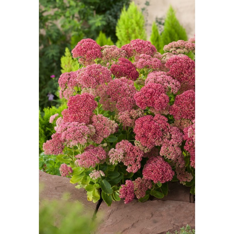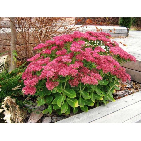 Rozchodnik karpacki ‘Autumn Joy’ (Hylotelephium telephium ‘Autumn Joy’) to ceniona, wieloletnia bylina o niezwykle dekoracyjnych, płaskich kwiatostanach, które pojawiają się od sierpnia i zdobią ogród aż do późnej jesieni. Kwiaty początkowo mają delikatny, różowy kolor, by z czasem przybrać intensywnie malinową barwę, przyciągając motyle, pszczoły i trzmiele. Roślina tworzy gęste, wyprostowane kępy o grubych, mięsistych liściach w odcieniu szaro-zielonym, co dodatkowo podkreśla jej ozdobny charakter.