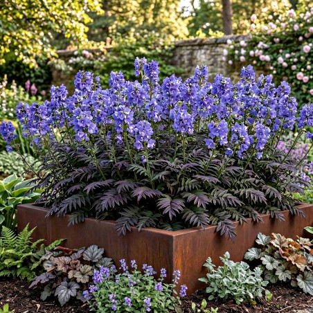 Intrygujące, kontrastowe ulistnienie: Ciemne, mocno purpurowe pędy i liście na przedwiośniu stanowią spektakularne, wręcz teatralne tło dla pastelowych, błękitnych dzwoneczków. To rzadkie zestawienie, które nadaje przestrzeni szlachetnego charakteru.