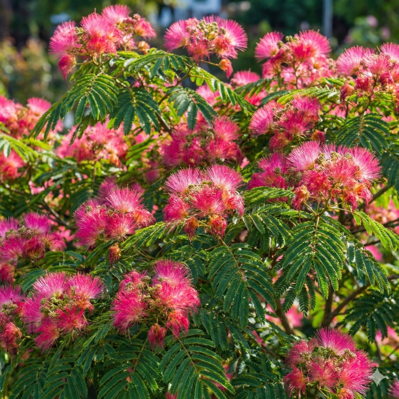 Długie i obfite kwitnienie: W przeciwieństwie do wielu drzew, które kwitną krótko wiosną, albicja zdobi ogród przez niemal całe lato (od lipca do września).