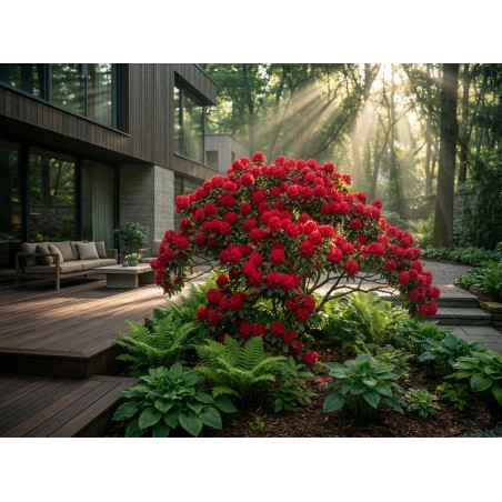 Spektakularny, krwisty kolor: Odmiana 'Red Jack' szczyci się jednym z najczystszych, najpiękniejszych odcieni głębokiej czerwieni wśród wszystkich rododendronów. Jej płatki nie blakną szybko w słońcu, zachowując swój wyrazisty, niemal drapieżny charakter aż do końca kwitnienia.